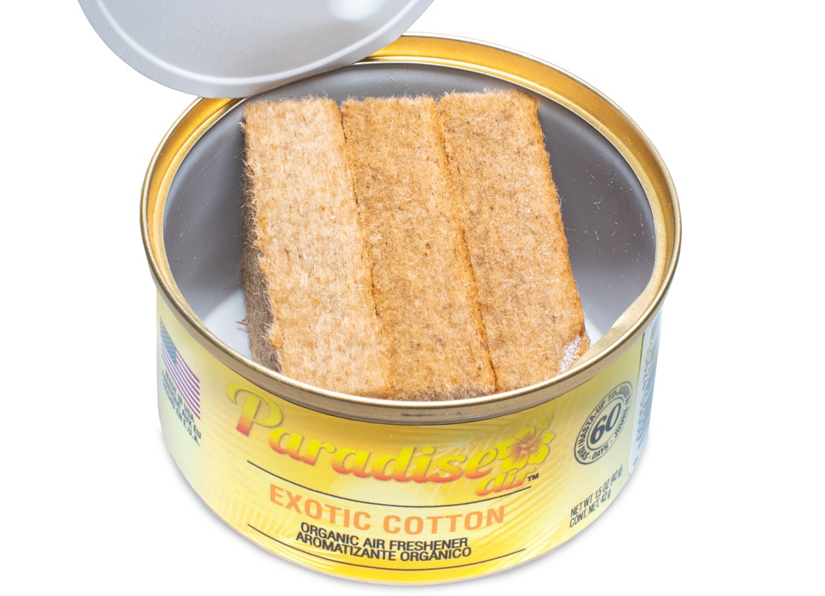 Každá plechovka vůně Paradise Air Organic obsahuje tři bloky lisovaného lnu napuštěného parfémem.