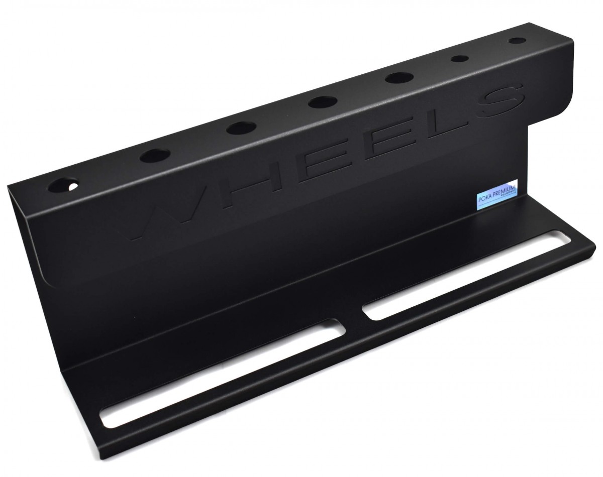 Poka Premium Holder for brush and bottles Wheels je nástěnný držák mixovacích lahví a detailingových štětců určených pro detailing kol o velikosti 40 cm.