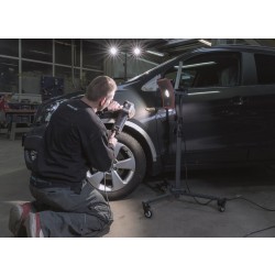 Uchycení světla na WHEEL STAND je rychlé a jednoduché, a velmi rychle si tak mlžete nasměrovat pracovní světlo přesně tam, kam potřebujete. Po skončení práce můžete stojan jen odsunout stranou, aby Vám nepřekážel.