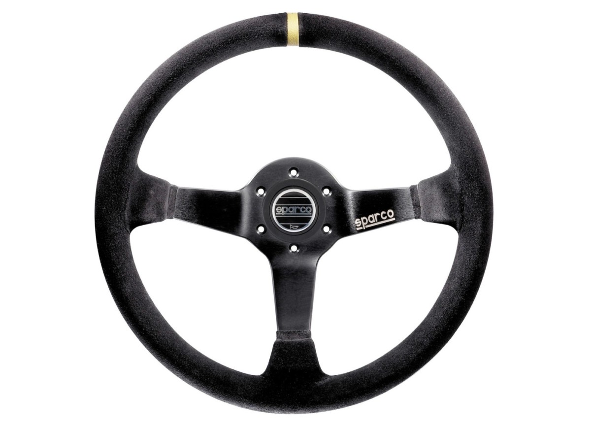 Závodní semišový volant Sparco R325 s odsazením a pruhem pro označení přímého směru.